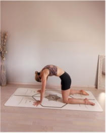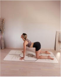 Position de départ : Débutez en se plaçant en posture de la table à quatre pattes, épaules au-dessus des poignets, hanches au-dessus des genoux. Inspirez pour aller chercher l’ouverture de toute la colonne : le regard vers le haut, les épaules enroulées vers l’arrière, les ischions enroulés vers le haut de la tête.