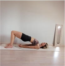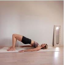 Position de départ : Allongé sur le dos, placez les pieds parallèles l’un à l’autre, largeur des hanches, sous les fessiers. Les bras sont le long du buste au sol : expirez pour enrouler la colonne et décoller le bassin puis le dos. Les hanches vers la diagonale haute cherchent à ouvrir tout l’avant du corps et à activer tout l’arrière.