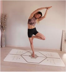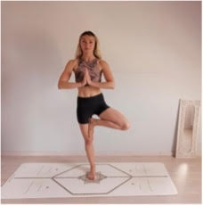 Position de départ : Debout, transférez le poids du corps sur la jambe droite pour venir lever la jambe gauche tout en pliant le genou vers l’extérieur. Gardez le bassin dans l’axe. Les mains peuvent être en anjali mudras (paume contre paume) devant soi ou bras tendus vers le haut. Le buste est aligné au centre (pas de bassin qui part sur un coté).