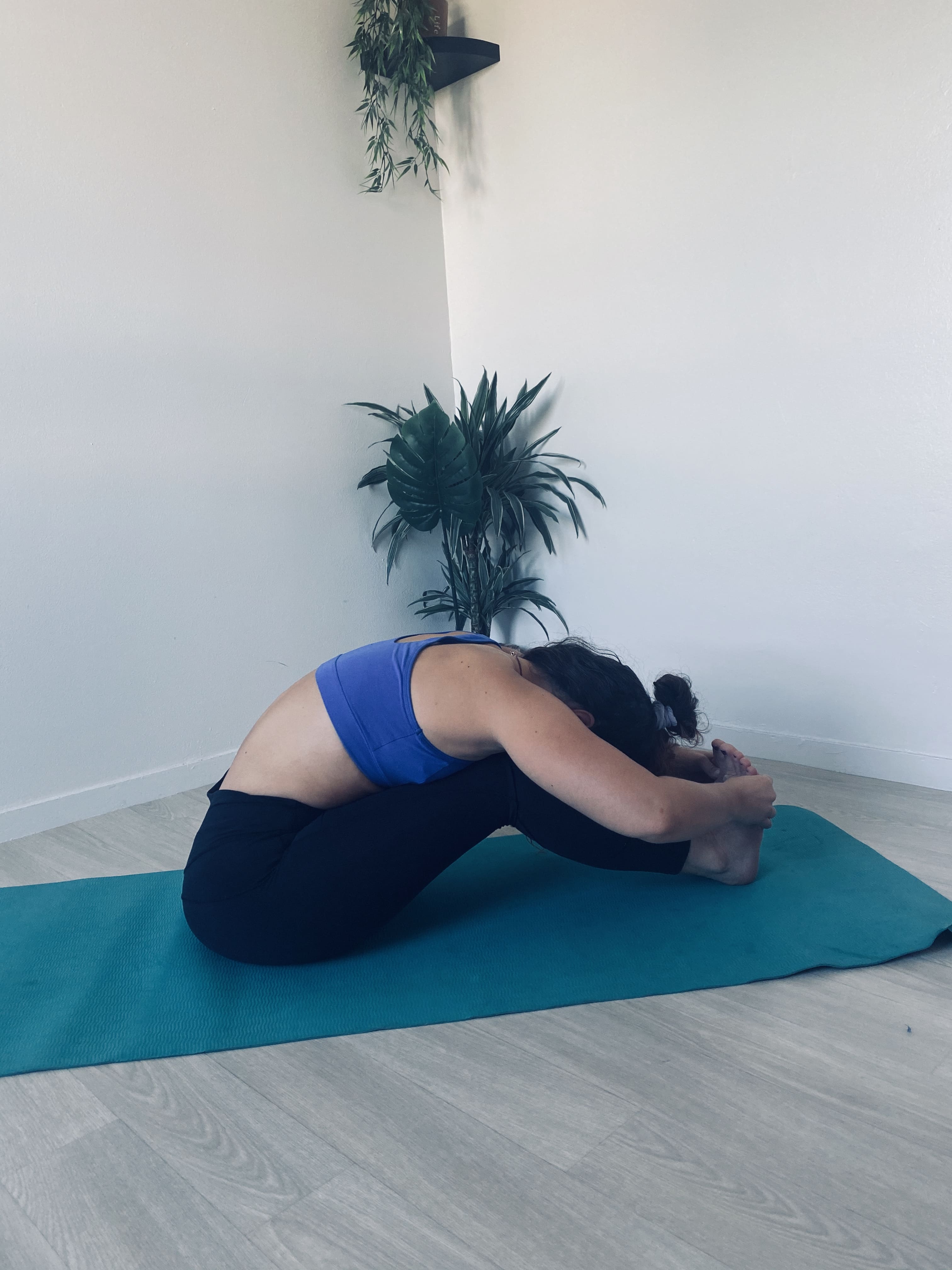Assis une jambe allongée et une autre pliée par-dessus celle du sol.