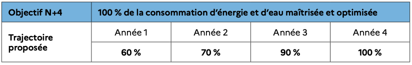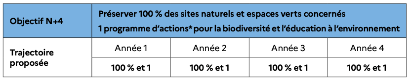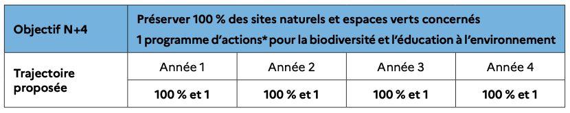 Cet engagement peut se traduire par des objectifs chiffrés différents comme par exemple : aucun gaspillage d’eau, 100 % des éclairages éteints s’il n’y a pas un besoin impératif de lumière, 100 % des arrosages issus d’eaux non potables, obligation de passer des contrats pour des énergies vertes, pas d’usage de la climatisation, baisse de X% du temps d’utilisation, etc.