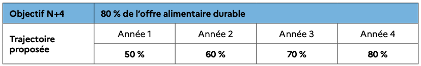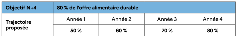 L’atteinte de cet objectif nécessite l’intégration des objectifs de cette charte dans les cahiers des charges de consultation ou avenants. Conscients également des contraintes de calendrier contractuel liant les organisateurs et les opérateurs de restauration, les objectifs annuels intermédiaires de cet engagement peuvent être modulés si l’objectif à horizon 2025 est maintenu.