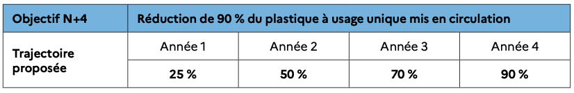 - Suppression de 90 % du « plastique à usage unique » mis en circulation (hors produits médicaux) par rapport à un événement de référence (édition antérieure, événement similaire, projet initial avant la mise en place de la politique de réduction des déchets). En dernier recours, lorsque l’accès à la donnée est impossible, l’objectif sera de limiter au maximum le plastique à usage unique et de se rapprocher le plus possible du 0 plastique à usage unique » ;