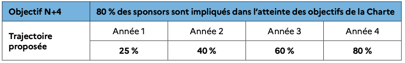 L’atteinte de cet objectif nécessite l’intégration d’objectifs de cette charte dans les contrats de sponsoring ou leurs avenants. Il s’agit de donner une nouvelle dimension aux partenariats de sponsoring en les rendant plus écoresponsables par leur soutien à des actions sociales, environnementales et sociétales cohérentes avec les engagements de la Charte.