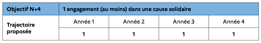 L’organisation définit au moins un engagement dans une cause solidaire (en lien avec la politique Écoresponsabilité & Héritage définie préalablement, le cas échéant). Cet engagement doit prendre la forme d’un engagement pluriannuel. Il peut s’articuler autour de :