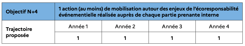 Pour prendre en compte à la fois les contraintes de calendrier contractuel liant les organisateurs et leurs sponsors, et les contraintes imposées par les cahiers des charges internationaux sur certains événements, les objectifs annuels intermédiaires de cet engagement peuvent être modulés si l’objectif année 4 est maintenu.
