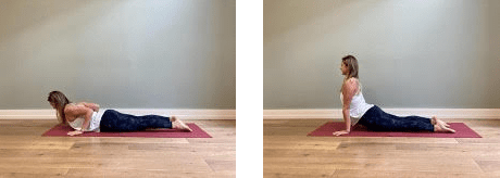 Installation : Depuis le 4 pattes, allongez-vous sur le ventre. Placez les mains de chaque côté de la poitrine, coudes serrés contre le buste et épaules bien en arrière. À l’inspiration, poussez sur les mains pour soulever le buste du sol. Conservez bien la nuque dans le prolongement de la colonne et rentrez légèrement le menton à la poitrine. À l’expiration, roulez les épaules vers l’arrière pour les éloigner des oreilles.