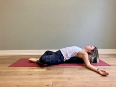 Installation : Asseyez sur le tapis, et placez un bolster (ou long coussin, ou traversin) derrière soi. Aidez-vous ensuite des mains pour allonger délicatement le dos contre le coussin. Le coussin est placé sous de dos depuis le bas du dos jusque derrière la tête. Si le coussin n’est pas assez long, placez-le en priorité sous les omoplates pour ouvrir la cage thoracique.