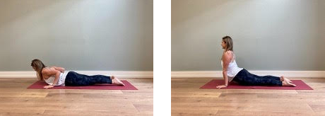 Installation : Depuis le 4 pattes, allongez-vous sur le ventre. Placez les mains de chaque côté de la poitrine, coudes serrés contre le buste et épaules bien en arrière. À l’inspiration, poussez sur les mains pour soulever le buste du sol. Conservez bien la nuque dans le prolongement de la colonne et rentrez légèrement le menton à la poitrine. À l’expiration, roulez les épaules vers l’arrière pour les éloigner des oreilles.