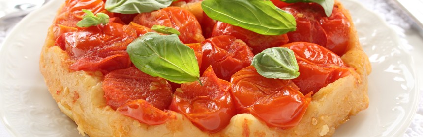 INGRÉDIENTS :• 2 barquettes de tomates cerises allongées Azura Zéro Résidu de Pesticide• 2 cuillères à soupe de miel• 2 cuillères à soupe d’ail en poudre• 2 cuillères à soupe d’herbes de Provence• 1 pincée de sel de Guérande• Une petite buche de chèvre• Une pâte brisée• 2 cuillères à soupe de sucre de canne PRÉPARATION : Préchauffez le four