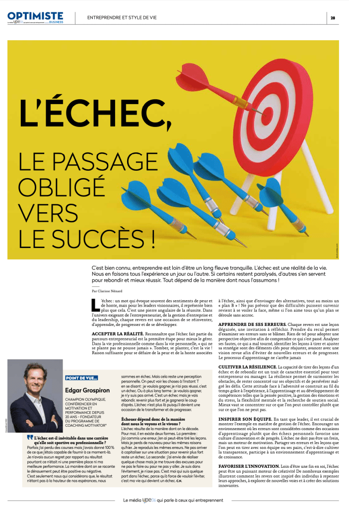 - EDGARD GROSPIRON, Champion Olympique – Conférencier en motivation et performance depuis 20 ans – Fondateur du programme de coaching MOTIVATOR® « L’échec n’existe pas en soi, c’est une perception de l’esprit, une interprétation que l’on peut avoir d’une situation. »