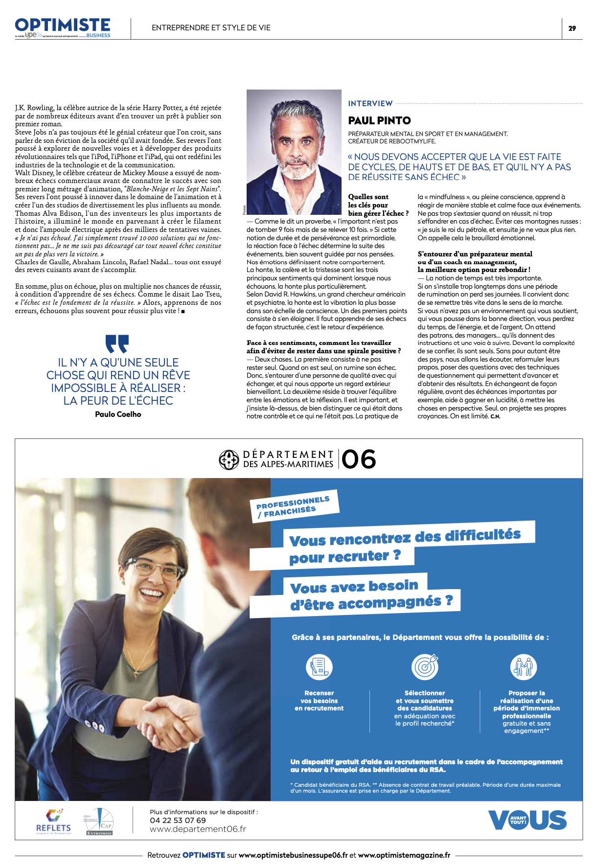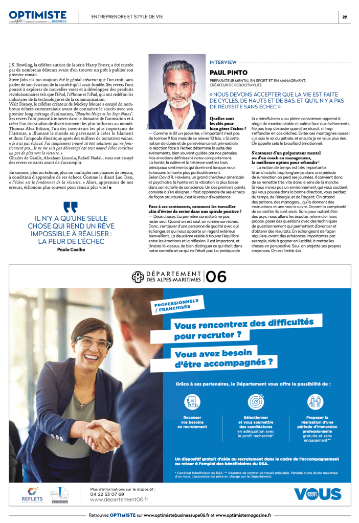 - PAUL PINTO, Préparateur mental en sport et en management – créateur de Rebootmylife « Nous devons accepter que la vie est faite de cycles, de hauts et de bas, et qu’il n’y a pas de réussite sans échec. »