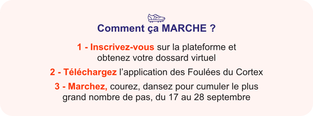Rejoignez moi en vous inscrivant sur 👉 Les Foulées du Cortex et téléchargez dès maintenant l’application officielle du challenge sur App Store ou Google Play pour courir ou marcher où et quand vous le voulez… au profit de l’Institut du Cerveau.