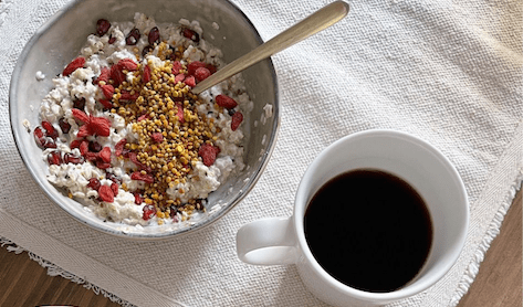 Pour 1 personne. Ingrédients Environ 40g de flocons d’avoine sans glutenEnviron 250 ml de lait végétal (nous aimons bien ceux à l’avoine ou au coco, sans sucres ajoutés)1/2-1 cuillère à café d’huile de cocoOptionnel : un peu de poudre de cannelle et/ou de cardamome Topping revitalisant :1-2 cuillères à café de baies de goji1 cuillère à soupe de pollen frais. Préparation Réchauffez les flocons d’avoine, le lait, l’huile et